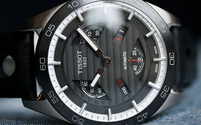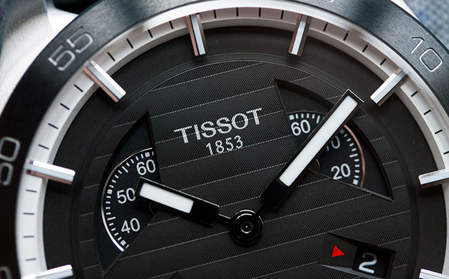 Наличие таких крупных элементов компенсируется весьма небольшим присутствием текста: надпись «Tissot 1853» на 12 часах, «Automatic» на 6 часах, аппертура для даты на 4 часах и для эмблемы PRS 516 на 8 часах. Все эти элементы расположены зеркально относительно друг друга, за счет чего циферблат выглядит крайне гармонично без ощущения перегруженности.