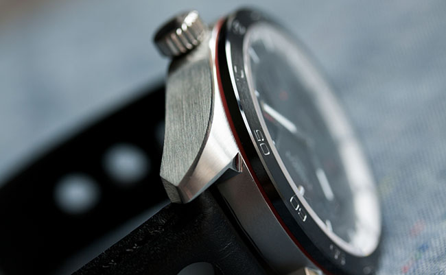 Первое, что невольно приковывает внимание, – это черный керамический безель. Такой материал в часах – уже достаточно интересная деталь, однако создатели усилили эффект с помощью выгравированных цифр и нижнего красного слоя, который бросается в глаза при взгляде со стороны. Несмотря на очевидную ассоциацию с гоночным спортом, этот безель таит в себе едва заметный нюанс. Лишь понаблюдав за отблесками на свету, можно заметить, что на его поверхность нанесен особый матовый узор, напоминающий специфическую текстуру карбон-керамических тормозных систем. Этот весьма деликатный штрих наполняет чувством принадлежности к узкому кругу посвященных.