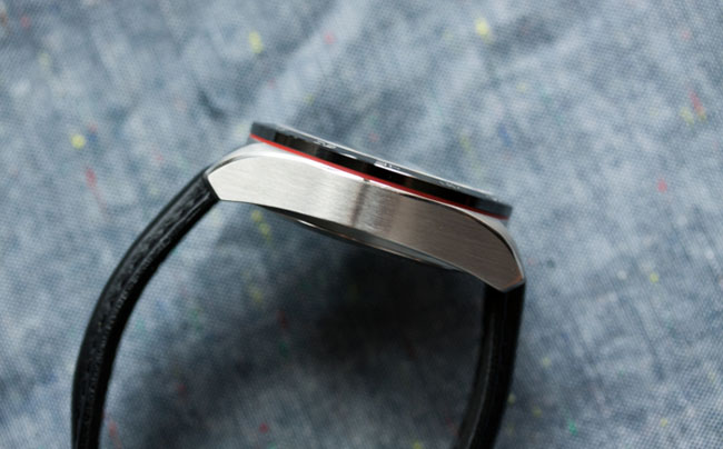 Нарушая границы черного цвета и придавая эффектную контрастность, по внешнему краю циферблат обрамляет белая шкала. На ней располагаются прямоугольные часовые индексы с люминесцентным покрытием. Казалось бы, ничего особенного, но только на первый взгляд. Стоит лишь взглянуть на часы под другим углом, как становится понятно, что метки лишь наполовину прикреплены к делениям, а другой их конец нависает над циферблатом точно так, как крошечные трамплины для прыжков над бассейном. Такой прием придает часам объем и глубину.
