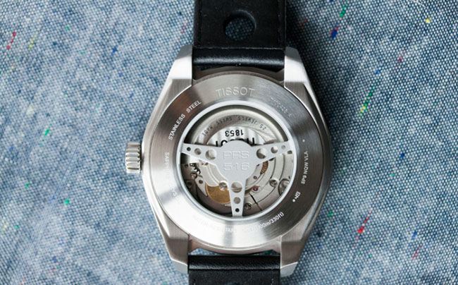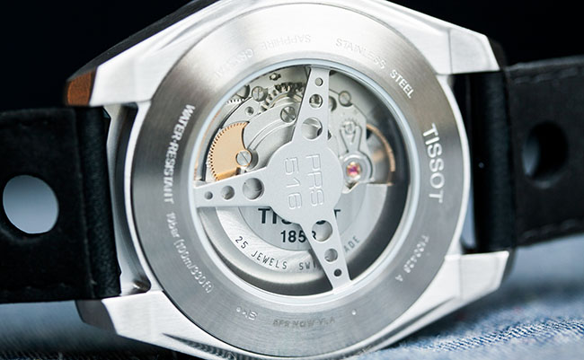 Сзади корпус закрыт крышкой в виде рулевого колеса гоночной машины с надписью PRS 516. Наблюдать сквозь нее наблюдает за работой механизма 2825-2. Истинное наслаждение! Ротор изумительно украшен: на нем отчетливо видны диагональные узоры Côtes de Genève. Остальные детали не декорированы, но все равно приятны глазу из-за своей отточенности и слаженности. Есть там и эмблема Tissot, но ее трудно заметить, поскольку руль перекрывает обзор.