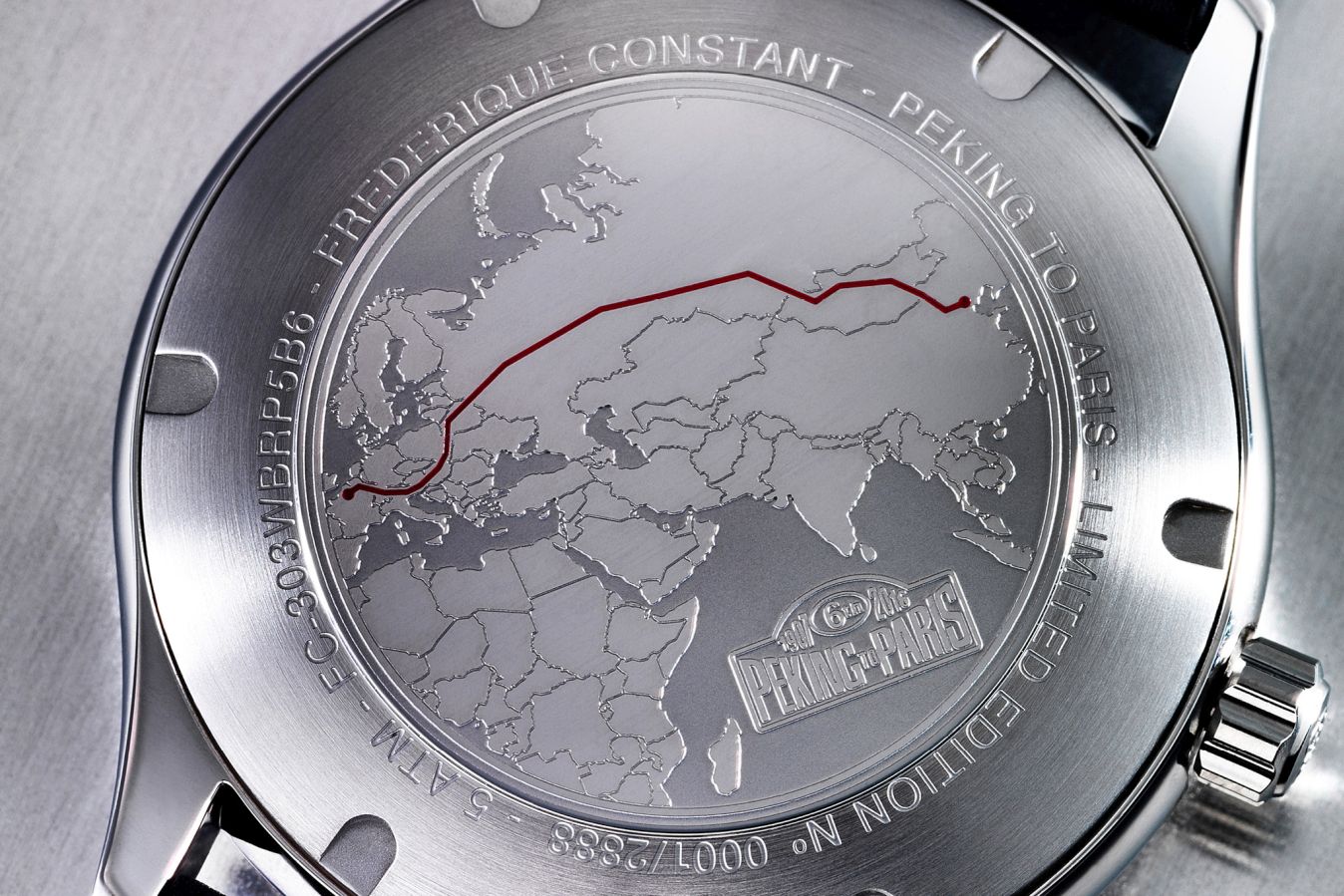 Задняя сторона корпуса, как и ожидалось, непрозрачна, выполнена из нержавеющей стали. На ней нанесена гравировка с Винтажной картой ралли, показывающей путь от Пекина до Парижа, с маршрутом, представленным при помощи линии цвета красного бургунди (в этих часах можно рассмотреть множество точек этого оттенка). Следует отметить, что использование контрастного цвета всегда смотрится сдержанно, скромно и с тонким вкусом.
