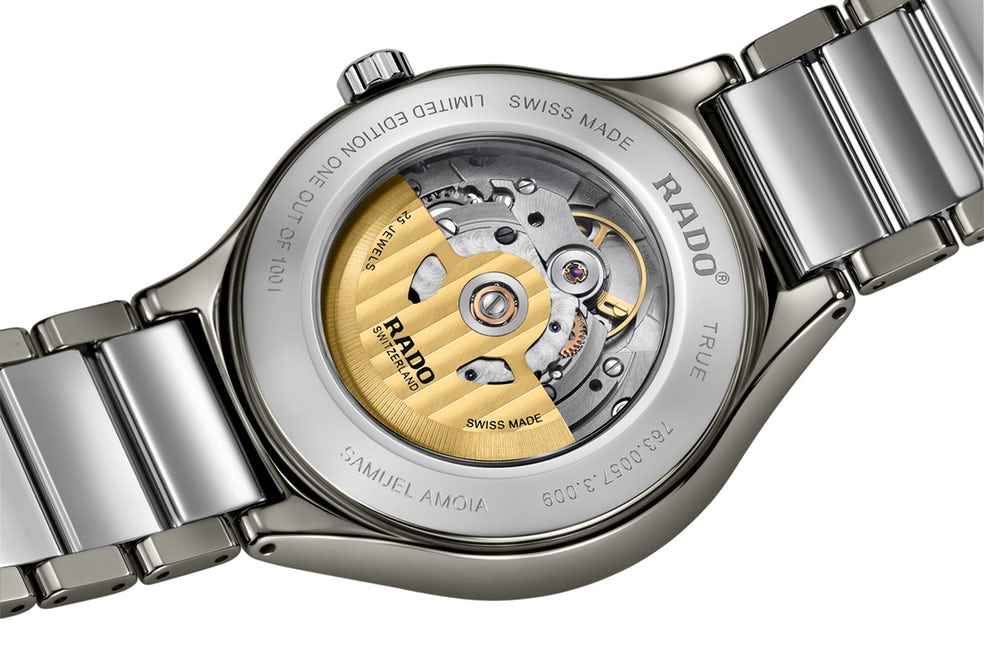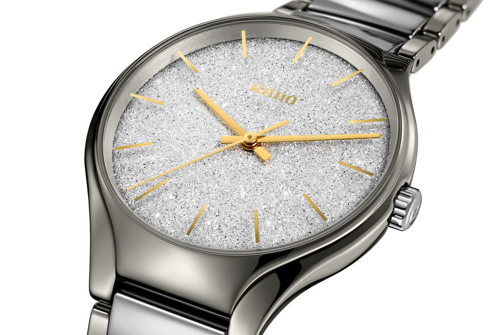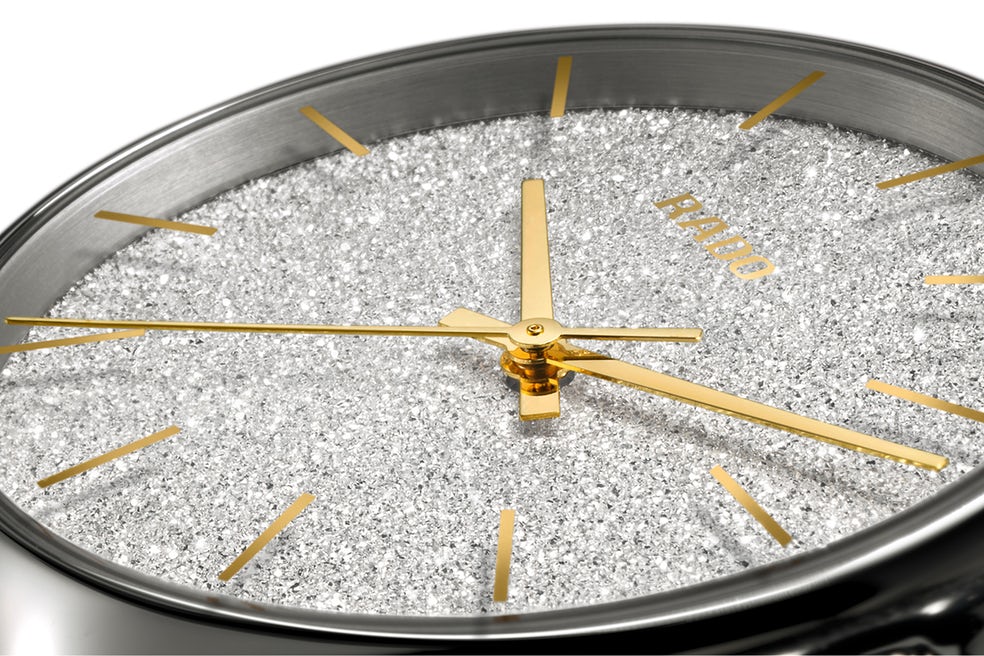 Тем не менее, этот циферблат, действительно, подходит к этим часам. Знатоки мебели от Сэма Амоии (Sam Amoia's furniture) сразу поймут, почему это утверждение имеет смысл. Американский дизайнер известен тем, что работает с металлическими и каменными фрагментами, создавая детализированные текстуры на различных простых формах. Именно этот подход он использовал и здесь. Циферблат выглядит так, как будто он покрыт крошечными бриллиантами, хотя, на самом деле, это сплошной кусок металла, поверхность которого была подвергнута гальванической обработке для создания тонкой текстуры. Представители Rado заявляют, что эта новая технология была разработана специально для их часов. Не желая нарушать текстуру поверхности индексами, Амоя и Rado нанесли жёлто-золотые часовые метки и надписи на внутреннюю сторону сапфирового стекла, поэтому они фактически зависают над самим циферблатом.