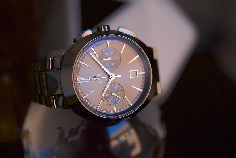 Автоматический хронограф Rado DStar: корпус 44 мм из высокотехнологичной плазменной керамики / титана; сапфировое стекло с антибликовым покрытием; прозрачная сапфировая задняя крышка; водостойкость при погружении на 100 м.