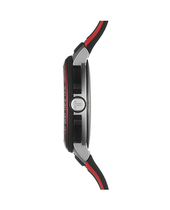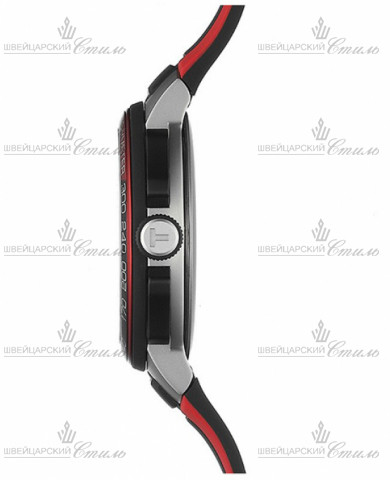 Диаметр: 44 мм. Калибр: ETA G10.212. Кварцевый хронограф. Индикация даты. Тахиметрическая шкала. Алюминиевый безель. Часовая шкала: Нарисованные метки. Стрелки: Стальные с покрытием SuperLuminova. Черный циферблат. Браслет: Каучуковый ремешок красного цвета. Классическая пряжка. Международная гарантия 2 года.