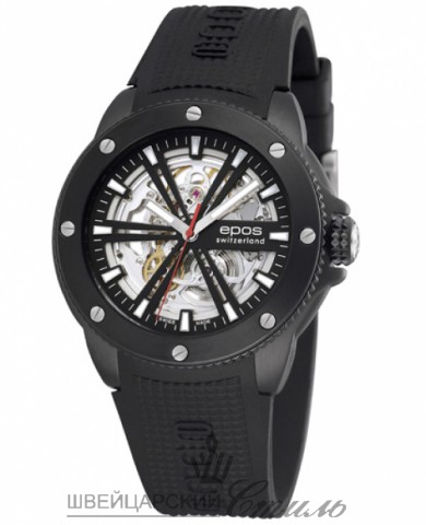 Диаметр: 43 мм. Декорированный механизм с автоподзаводом. Скелетон. Браслет: Черный каучук. Закручивающаяся прозрачная задняя крышка. Закручивающаяся заводная головка.