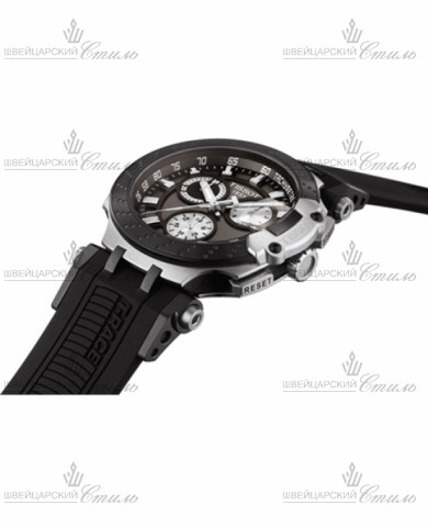 Диаметр: 43 мм. Калибр: ETA G10.212. Кварцевый хронограф. Индикация даты. E.O.L-индикация разряда элемента питания. Тахиметрическая шкала. Часовая шкала: Нарисованные метки. Стрелки: Стальные с покрытием SuperLuminova. Серый циферблат. Браслет: Каучуковый ремешок черного цвета. Классическая пряжка. Международная гарантия 2 года.