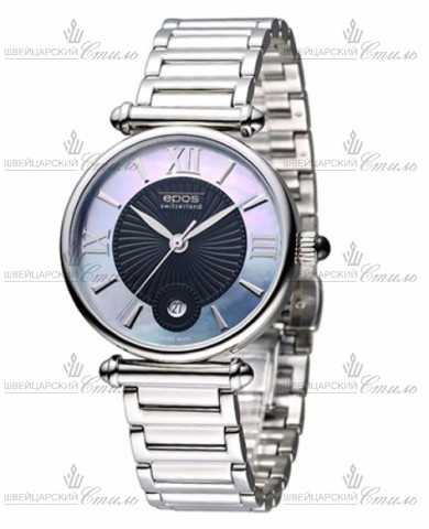 Диаметр: 34 мм. Гильошированный перламутровый циферблат. Индикатор даты. Заводная головка украшена сапфиром в форме кабашона. Цифры римские, индексы. Браслет: нержавеющая сталь