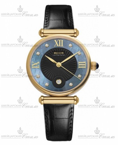 Диаметр: 34 мм. Гильошированный перламутровый циферблат декорирован 8 бриллиантами. Индикатор даты. Заводная головка украшена сапфиром в форме кабашона. Цифры римские. Кожаный ремешок с клипсой