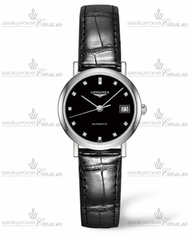 Диаметр: 25,5 мм. Механизм с автоподзаводом. Калибр L595/592. Индикация даты. Запас хода 40 часов. Черный циферблат декорирован 12 бриллиантами 0,026 ct. Прозрачная задняя крышка с сапфировым стеклом. Ремешок из кожи аллигатора