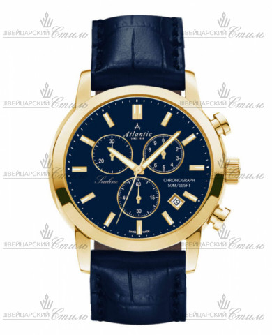 Диаметр: 44 мм. Калибр: ETA G10.212. Кварцевый хронограф. Индикация даты. Часовая шкала: Накладные часовые метки. Стрелки: Стальные с покрытием PVD и люминесцентным покрытием. Синий циферблат. Браслет: Кожаный ремешок синего цвета. Классическая пряжка. Международная гарантия 2 года.