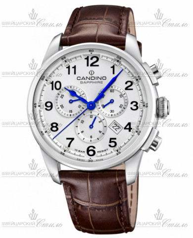 Диаметр: 44 мм. Калибр: Ronda. Кварцевый хронограф. Индикация даты. Часовая шкала: Арабские цифры. Стрелки: Стальные. Белый циферблат. Браслет: Кожанный ремешок коричневого цвета. Застежка: Класическая пряжка. Международная гарантия 2 года
