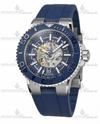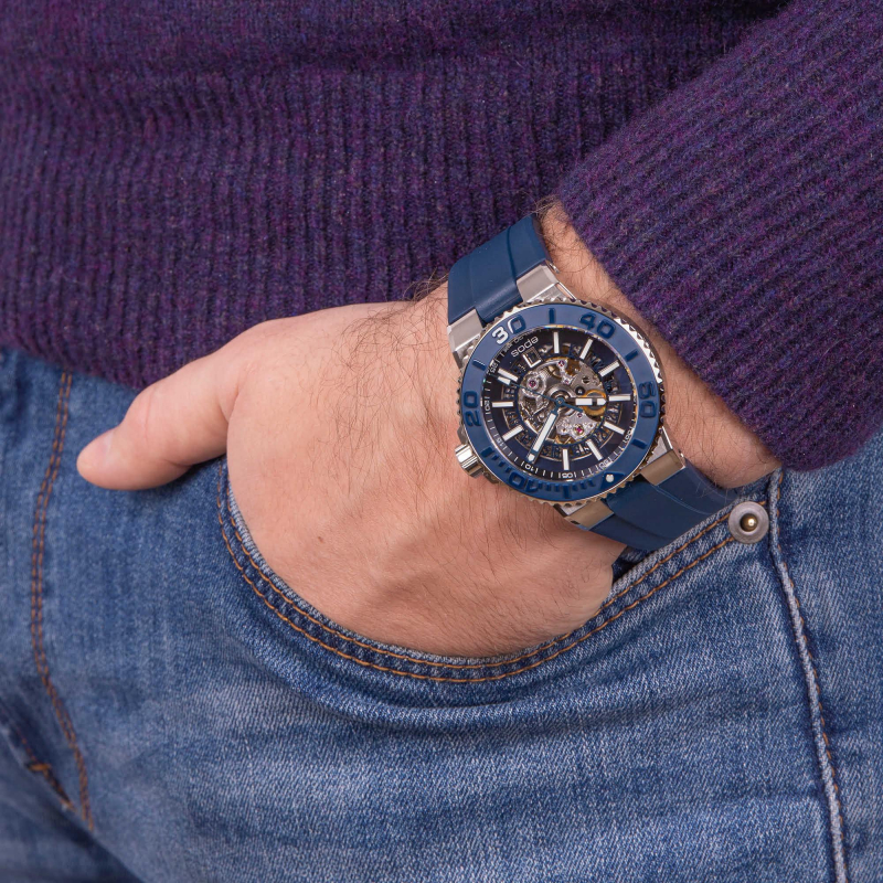 Диаметр: 43 мм. Калибр: SW 200. Механизм с автоподзаводом. Запас хода 38 часов. Индикация даты. Прозрачная задняя крышка. Вращающийся керамический безель. Сапфировое стекло. Часовая шкала: Накладные метки. Стрелки: стальные с покрытием SuperLuminova. Синий циферблат. Браслет: Каучуковый ремешок синего цвета. Застежка с системой блокировки и кнопкой. Международная гарантия 2 года.