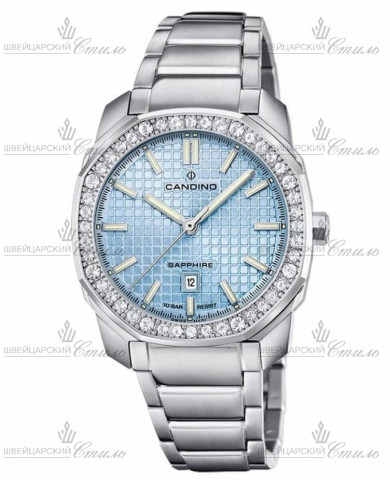 Диаметр: 35 мм. Толщина: 8,5 мм. Калибр: RONDA 785. Индикация даты. Часовая шкала: индексы. Стрелки: стальные с люминесцентным покрытием. Бирюзовый, гильошированный циферблат. Инкрустированный цирконами безель. Браслет: Нержавеющая сталь 316L. Застежка клипса. Международная гарантия 2 года