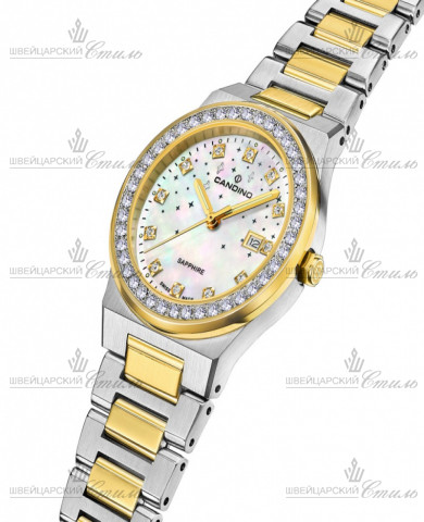 Диаметр: 34 мм. Толщина: 7,7 мм. Калибр: RONDA 785. Часовая шкала: Цирконий. Стрелки: стальные с PVD покрытием и люминесцентным покрытием. Перламутровый циферблат. Инкрустированный цирконами безель. Браслет: Нержавеющая сталь 316L с PVD покрытием. Застежка клипса. Международная гарантия 2 года