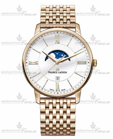 Диаметр: 40 мм. Индикация даты. Указатель фаз Луны. Белый лакированный циферблат. Часовые и минутные стрелки с алмазнои? обработкои? и покрытием из золота 4N. Римские цифры и индексы. Браслет: нержавеющая сталь с покрытием PVD. Международная гарантия 2 года. Baselworld 2016