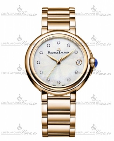 Диаметр: 32 мм. Индикация даты. Перламутровый гильошированный циферблат декорирован 11 бриллиантами 0,05 ct. Браслет: нержавеющая сталь c PVD покрытием с раскладывающейся застежкой
