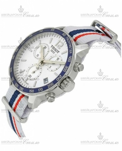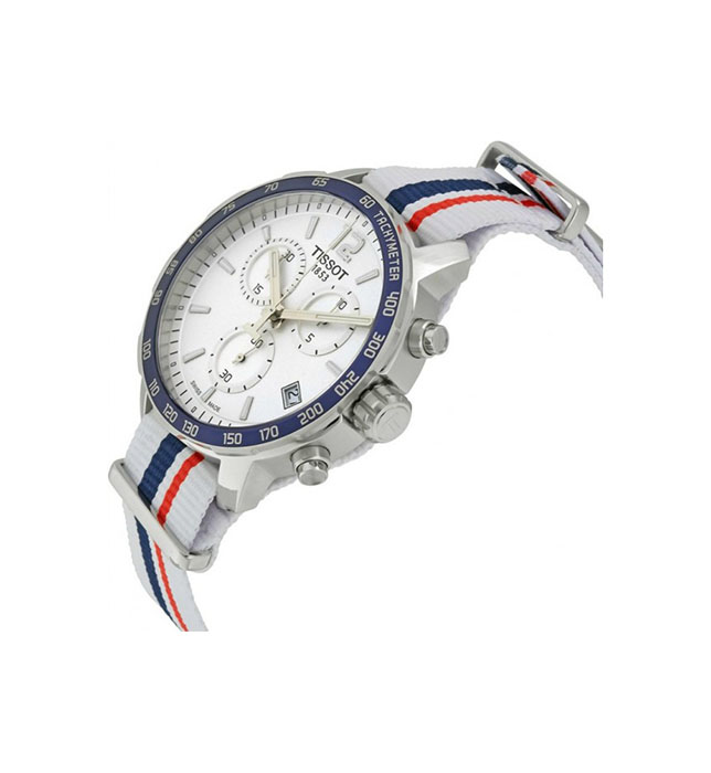 Диаметр: 42 мм. Калибр: ETA G10.211. Кварцевый хронограф. Индикация даты. Тахиметрическая шкала. Часовая шкала: Накладные арабские цифры и метки. Стрелки: Стальные с покрытием SuperLuminova. Белый циферблат. Браслет: Тканевый ремешок белого цвета. Классическая пряжка. Международная гарантия 2 года.