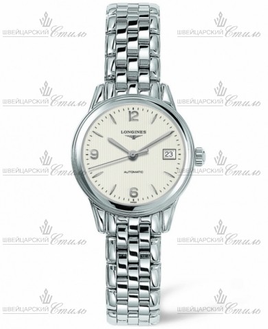 Диаметр: 26 мм. Калибр: L595/592. Механизм с автоподзаводом. Запас хода 40 часов. Индикация даты. Сапфировое стекло с антибликовым покрытием. Прозрачная задняя крышка корпуса. Часовая шкала: накладные арабские цифры и метки. Стрелки: посеребренные, полированные. Белый циферблат. Браслет: нержавеющая сталь. Тройная застежка с системой блокировки и кнопкой. Международная гарантия 2 года.