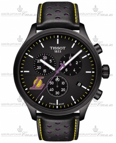 Диаметр: 45 мм. Калибр: ETA G10.212. Кварцевый хронограф. Индикация даты. Часовая шкала: Нарисованные метки. Стрелки: Стальные с покрытием SuperLuminova. Черный циферблат. Браслет: Кожаный ремешок черного цвета. Классическая пряжка. Циферблат украшает логотип команды NBA Los Angeles Lakers Special Edition. Международная гарантия 2 года.