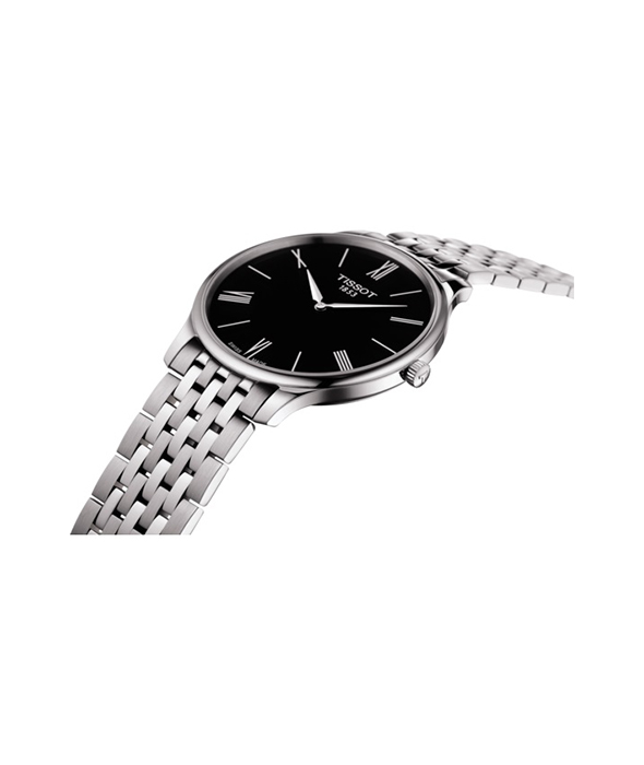 Диаметр: 39 мм. Калибр: ETA E64.031. Ультратонкий механизм. Часовая шкала: Нарисованные римские цифры и метки. Стрелки: стальные. Черный циферблат. Браслет: Нержавеющая сталь. Застежка с системой блокировки и кнопкой. Международная гарантия 2 года.